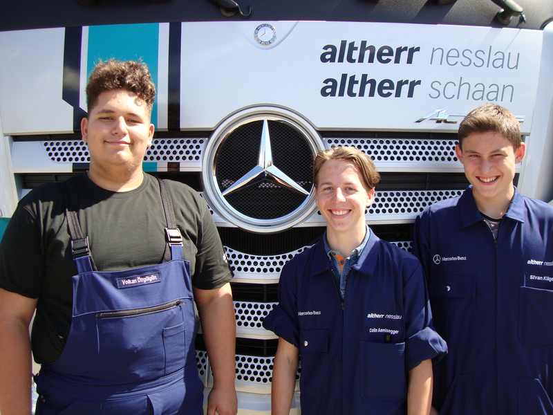 Wir heissen unsere neuen Lernenden in Nesslau herzlich Willkommen und wünschen ihnen im Berufsleben alles Gute! Von links: Volkan Özgülgün (Detailhandels-Fachmann), Colin Aemisegger, Silvan Kläger (beide Automobil-Mechatroniker Nutzfahrzeuge)