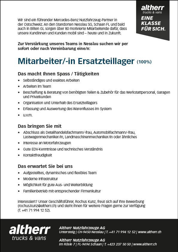 Zur Verstärkung unseres Teams in Nesslau suchen wir per sofort oder nach Vereinbarung eine/n Mitarbeiter/-in im Ersatzteillager und freuen uns auf Ihre Kontaktaufnahme.